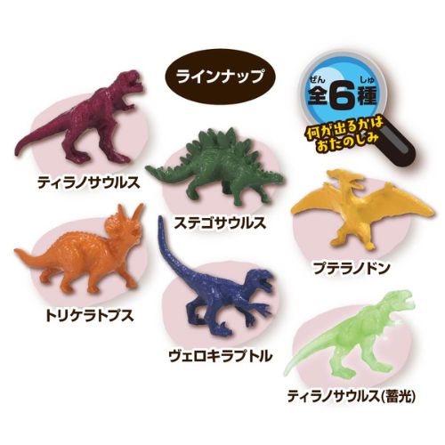 ティラノサウルス・トリケラトプス・ステゴザウルス・ヴェロキラプトル・プテラノドン・ティラノサウルス(蓄光)の内、1個入り。